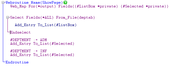 ここでもWeb_mapに注目してください。選択されたエントリーの入力リスト(#Selected)と、もうひとつ、出力リスト(#Report)です。これらを使用して、選択された部門をリスト表示します。