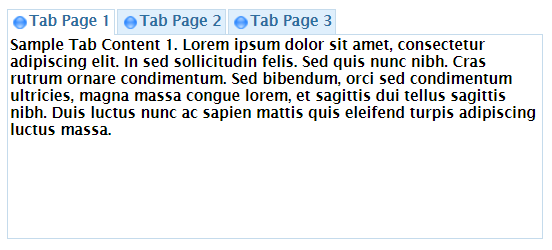 タブ・ページ・ウェブレットは、関連する情報をグループとしてまとめる際に使用できるタブ・コントロール機能を提供します。次の図はタブ・ページ・ウェブレットがWebページに埋め込まれた時にどのように表示されるかを示しています。この例では、共通情報はページのトップにグループ化されています。タブ・コントロールはその下に表示され、社員についての3つの情報グループ (Tab page 1、Tab page 2、Tab page 3) にアクセスできます。Contactsタブが表示されていますが、タブをクリックすることで、ユーザーは他のグループの情報を表示できます。