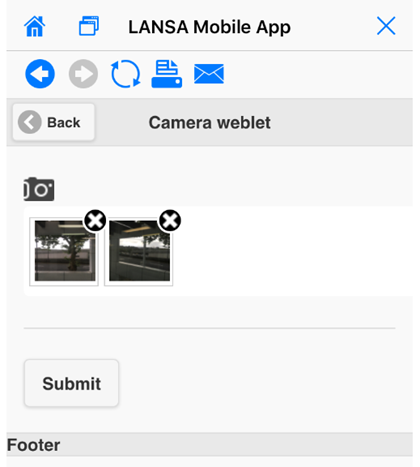 クィック・スタートプロパティ – モバイル・アプリのカメラモバイル・アプリのカメラ・ウェブレットを利用して、デバイスのカメラにアクセスでき、1枚または複数の写真の撮影が可能です。ページの送信時、この写真は指定のJSON webroutineにアップロードされます。