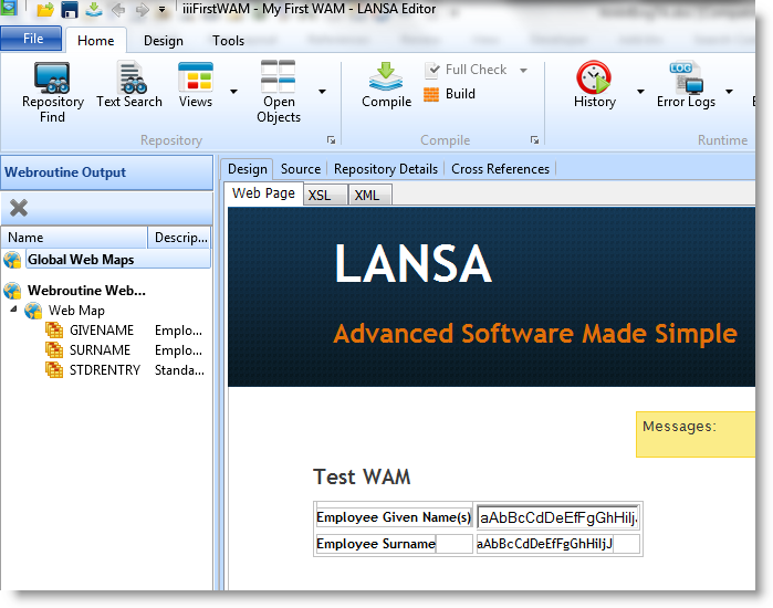 Once a WebRoutine has been compiled, a web page design with a WAM-specific layout (that you can modify) and field entry controls are generated and can be edited in the Design view.