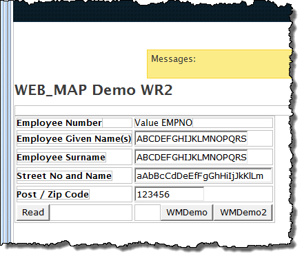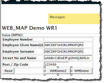 Note: The hidden EMPNO field is required so that a value will be mapped into the WebRoutine WMDemo2, when the WMDemo2 button is clicked.
