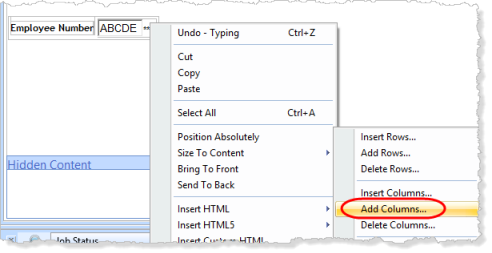 In this step you will add a column to the table containing employee number, and drag a push button weblet into the new cell.
