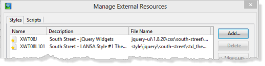 Close this dialog. - In the Design view for WebRoutine Details, on the Design ribbon, select the External Resources button. Use the Add button to add the two Styles required.