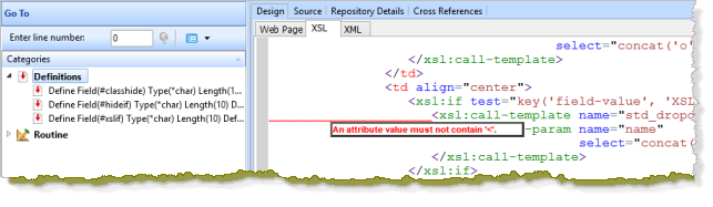The editor has autocomplete functionality. As you type, press enter to select the prompted code. Once you complete the<xsl:if with the >character, the end if (</xsl:if>) will be generated. Move the "end if" logic after the </xsl:call-template>.Note: If you click on the Design tab or try to save your XSL while your xsl changes contain errors, the errors will be reported on the Go To tab as shown in this example. In this case, there is a missing double quote at the end of the test condition.
