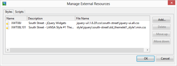 - With the Design view open, select the Design ribbon / External Resources button. Knowing your external resources (the cascading style sheets) used by your theme, delete the default files used by the weblet code provided and add the files for your theme.