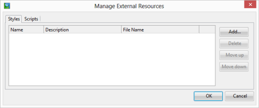 3. Click the Add button, select your external resource and click OK. Click OK to close the Manage External Resources dialog.