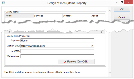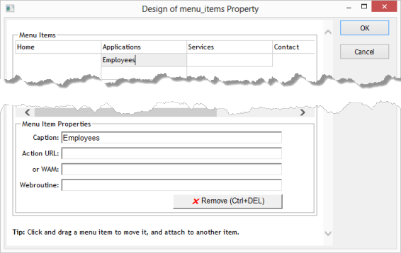 2. Select the menu bar weblet and use the Ellipsis button for the menu_items property to open the Design of… dialog, which should look like the following: