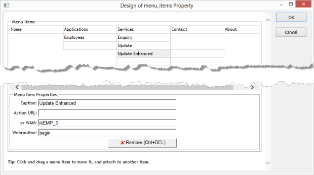 6. Click in the menu item to the right of Employees. This means you will be defining a sub-menu for Employees, which will be shown during the design step, under Services. Define Enquiry as: