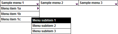 動的 HTML メニューバー・ウェブレットは、他のWEBROUTINEを含む他のWebページを呼び出すメニュー・バー機能を提供します。メニューバーは水平あるいは垂直に調整でき、最上位のメニュー・アイテムはマウスがその上に移動すると、更に次のメニューをポップアップします。水平に調整されたメニューバーは次のようになります。- この例では、2つのレベルのポップアップ・メニューが表示されています。