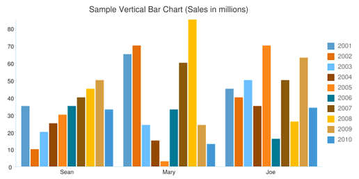 棒グラフは、そのデータ値の割合に応じて、データ要素を横または縦の棒で表示したものです。縦、横、グループ、および積み重ね棒グラフが作成できます。