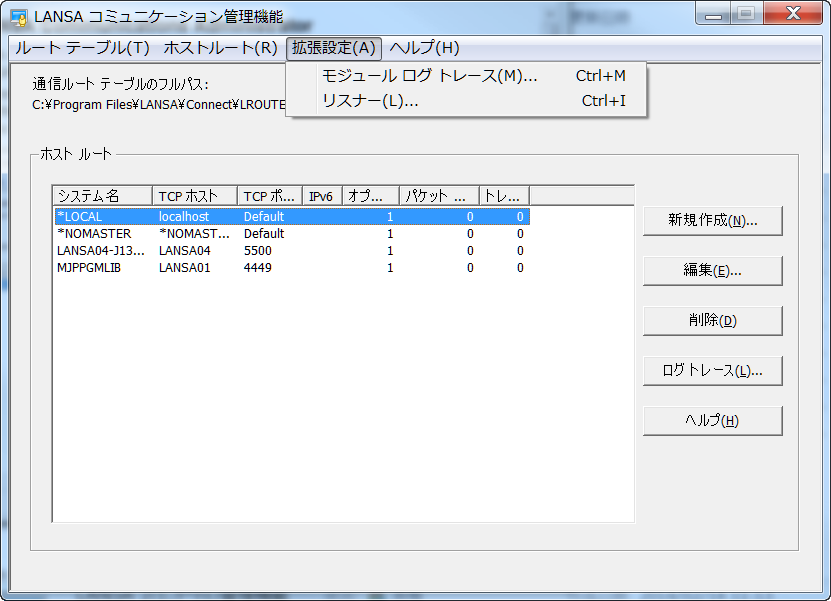 管理機能のメイン・ウィンドウには今まで設定されたホストルートのリストもしくは新しくLANSAをインストールした場合は省略値のホストルートが表示されます。