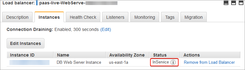 - スタックが配布されるのを待ちます。通常、この処理は最低でも40分かかります。負荷分散装置で DB Web サーバー・インスタンスが InService としてリストされたら、次のステップに進むことができます。