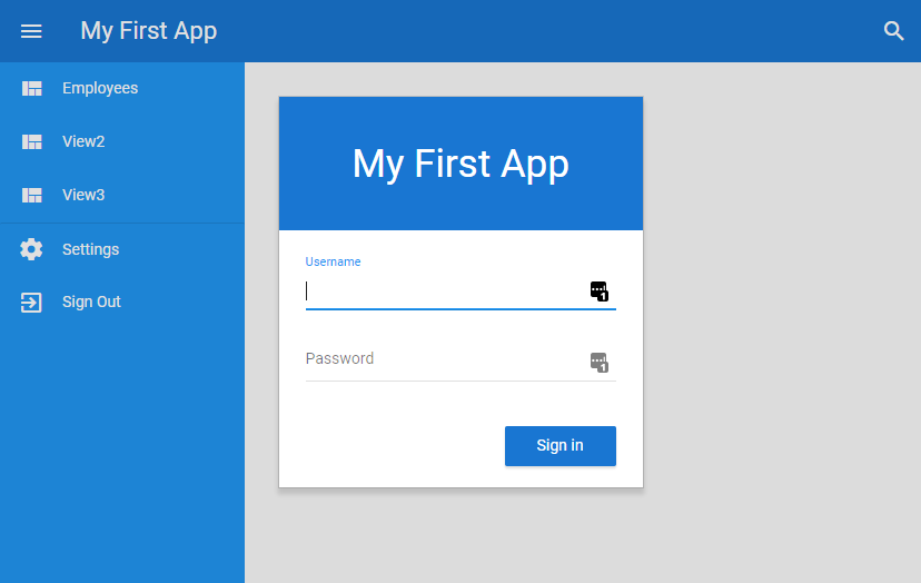 例:http://mysite.paas.customer.com/app1/dem/a01main.htmlこのページ、もしくは同様のページが表示されます。[Sign In] のクリックは作動しないことに注意してください。これは、アプリケーションにより配布されるテーブルと競合しないよう、テーブルが配置から削除されているからです。 - この 2 つの URL が動作すれば、次のステップに進むことができます。