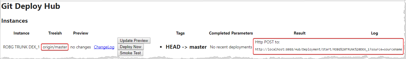 [Treeish] の欄には、現在のブランチ (この例では origin/master) が表示され、投稿先の URL も示されているはずです。この URL を GitHub の Web フックにコピーして、「ターゲット・システムに GitHub リポジトリを接続」のステップで使用します。