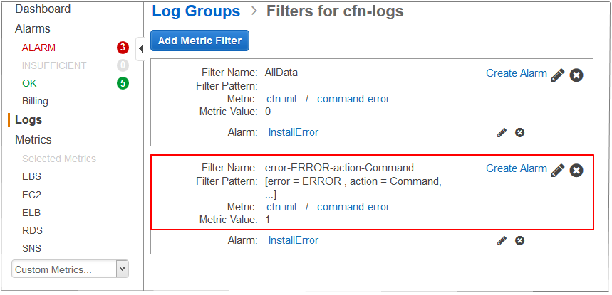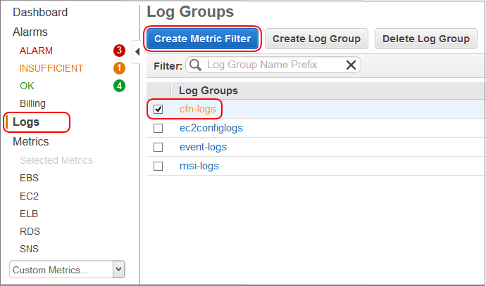 2. [Logs] をクリックして、[Log Groups] [cfn-logs] を選択します。次に [Create Metric Filter]をクリックします。