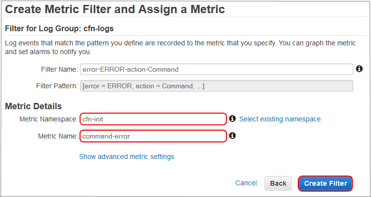 3. パターンを角括弧 – [ ] で囲み、スペースで区切ったフィルター・パターンを使用します。CloudFormation スクリプト実行中のエラーを検知するには、最初のフィールドでエラーを探し、2番目のフィールドにコマンド、残りのフィールドは関係ないので、そのことを示すために省略記号 (…) を使用します。サンプルのログ・データにエラー・ログのデータが含まれる場合、[Test Pattern] をクリックして、テストできます。その他の場合は、[Assign Metric] をクリックするだけです。