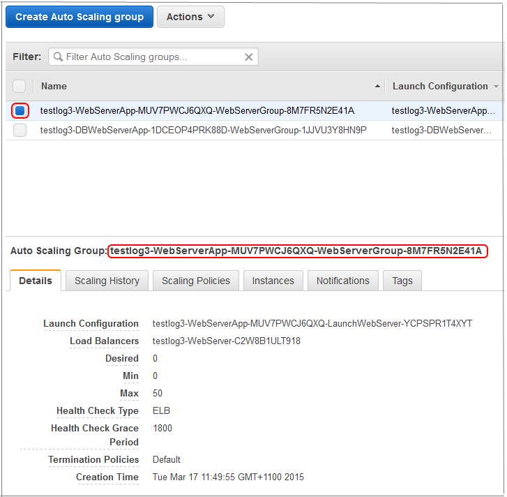 AWS コンソールを使って、自身の Auto Scaling グループの名前を取得します。EC2 ページを探し、 Auto Scaling グループに進みます。Auto Scaling グループの 1 つを選択し、以下の [Details] タブの名前をコピーします。