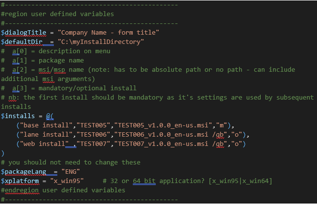 fsdExample.ps1 は、GUI を作成して選択の MSI を実行するパワフルな powershell です。上部では変数を定義でき、これを使ってスクリプトの動作をカスタマイズできます。