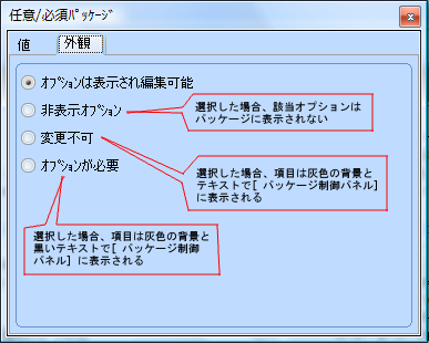 3. 外観のデフォルトを確認する | [外観]タブで、テンプレートを使用する場合のオプションやオプションのサブセットの表示方法を管理します。 [オプションは表示され編集可能] オプションは通常どおり動作し、選択や編集が可能になります。 [非表示オプション] オプションのツールバー・アイコンが使用不可になります。テンプレートのオプションに関連付けられている値はパッケージに適用されますが、これらの値へのアクセスが拒否されます。 [変更不可] オプションは表示されますが、変更はできません。[パッケージ/テンプレート・コントロール・パネル]ツールバーで該当のツールバー・アイコンは利用できますが、ダイアログの[OK]ボタンは使用不可になります。変更はすべて無視されます。 [オプションが必要] この必須オプションの背景が灰色で表示された場合、パッケージの生成前に検討が必要です。 |