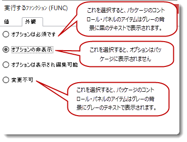 2 サブセットの外観のデフォルトを確認する | [外観]タブを使えば、テンプレートを使用する場合のオプションのサブセットの表示方法を、表示されている場合でも制御できます。 [オプションは表示され編集可能] オプションのサブセットは通常どおりに動作します。すべてのオプションは、各レベルで変更されていなければ選択可能になります。 [オプションの非表示] テンプレートを使用してバージョンを作成する場合、オプションのサブセットは表示されません。このサブセットの特定のオプションの値はパッケージに適用されますが、確認や変更は行えません。 [変更不可] オプションは表示されますが変更はできません。 |