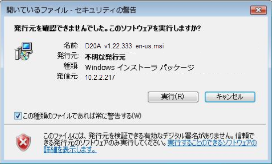 インストーラー・ファイルに有効なデジタル証明書の署名がある場合、以下の警告は無視されます。