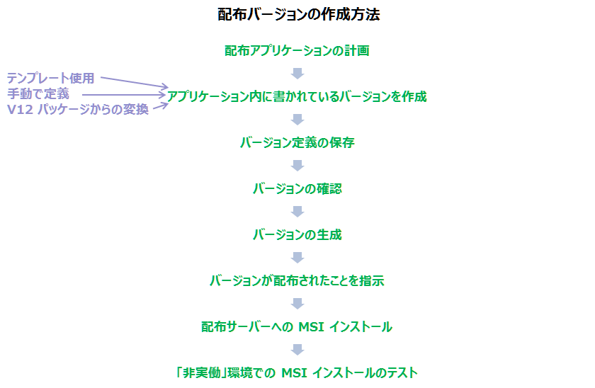 配布ツールを実行する主な目的は、配布バージョンの作成です。最初の配布バージョン作成の際の開始から終了までのプロセスを簡単に示すと、以下ようになります。アプリケーションを正しく配布するために、「配布の計画」時で大切なことは、必要なオブジェクトを含めること、そしてバージョン定義のための適切な「オプションと設定」を使用することです。