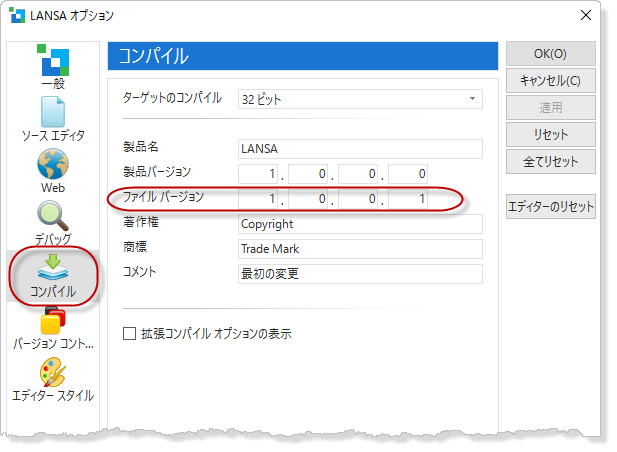 1. [ファイル] メニューの [オプション] を選択して、LANSA 設定を開きます。[コンパイル] オプションを選択し、以下に示すように [ファイル バージョン] を 1.0.0.1 に変更します。