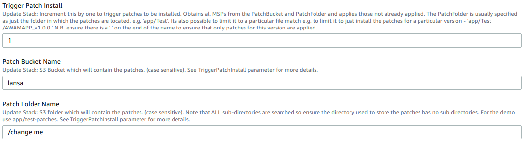 - パラメータ・リストでパッチ バケット名、パッチ フォルダ名、パッチ インストールをトリガーのパラメータまでスクロールします。
