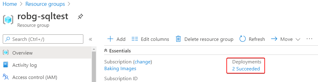 まず、デプロイしたリソース・グループを探して、以下の画像に示されている Deployments の下にある青の文字をクリックします。ここには、通常 "2 succeeded" (2 件成功) と表示されます。