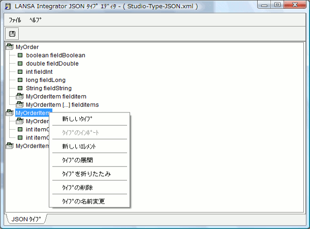 [JSON タイプ エディタ] を使って、タイプを作成し、管理できます。
