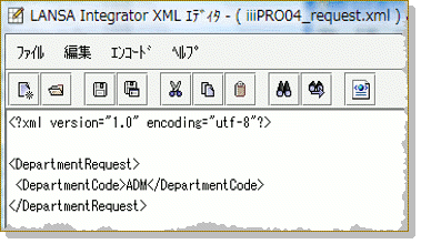 このステップでは、サーバー・ファクンションを作成するため、部門の記述の要求を受け取るXMLを作成します。どのテキスト・エディターを使用してもXMLを作成できます。ここでは、Integrator スタジオの一部であるXMLエディターを使用します。