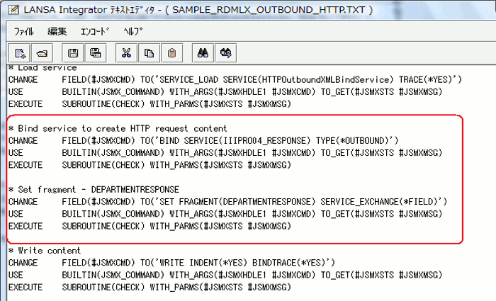 RDMLX コードは以下のようになります。#DEPTDESC := *NULLFETCH FIELDS(#DEPTDESC) FROM_FILE(DEPTAB) WITH_KEY(#DEPTMENT) IO_ERROR(*NEXT) VAL_ERROR(*NEXT)IF_STATUS IS_NOT(*OKAY)#DEPTDESC := '部門が見つかりません'ENDIF - 次にアウトバウンド HTTP のコンテンツを作成するコードを追加する必要があります。ソリューション XML 応答用にスタジオで生成された RDMLX から、このコード・フラグメントを取得できます。 XML 応答/samples/RDMLX フォルダを展開し、テキスト・エディターで SAMPLE_RDMLX_OUTBOUND_HTTP.txt を開きます。ファンクション iiiFN04 の以下のコメントの直後に、以下の赤い丸で囲まれたコードをコピーして貼り付けます。