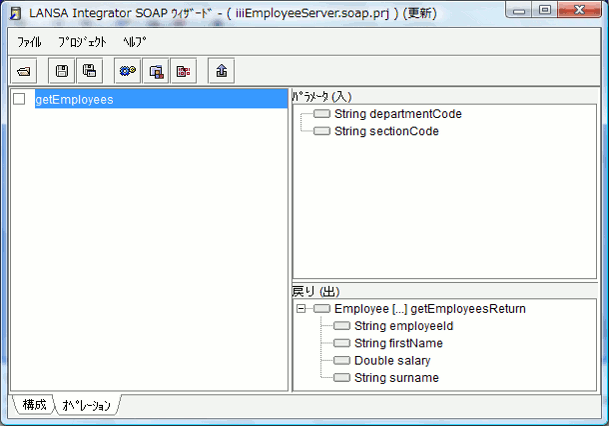 このステップでは、Web サービスの SOAP オペレーション GetEmployees を作成し、そのインバウンド・パラメータおよびアウトバウンド・パラメータを定義します。