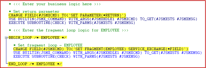 各社員の詳細が 1 つのフラグメントとして渡されることが分かっているので、生成されたコードにはループが含まれます。修正が必要となるのがこのコーディング部分で、社員ファイルから社員の詳細を読み込むために必要なロジックを追加する必要があります。