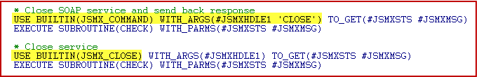 2. 次のステップは、ファンクション内のロジックの記述です。ます最初に、JSM サーバーへの接続を作成し、その後、SOAP サーバー・サービスをロードします。これは、JSMX_OPEN 組み込み関数と SERVICE_LOAD サービス・コマンドを使用して行います。