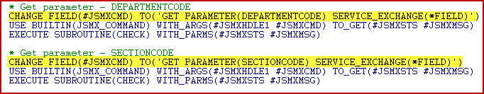 4. プログラムは GET PARAMETER サービス・コマンドを使用して、部門コードと課コードに対して受信した値を取得します。「ステップ 5. プログラム変数にパラメータをマッピングする」で、プログラム変数名にこれらのパラメータをマッピングしたことを思い出してください。これを呼び出すことで、変数が自動的に入力されます。