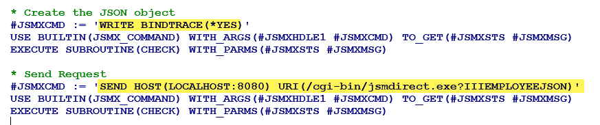 上記のコードのすぐ下に JSON オブジェクトを作成するコード (WRITE BINDTRACE(*YES)) と要求を送信するコード (SEND HOST…) を追加します。 URL は HOST と URI に分けなければいけないことに注意してください。