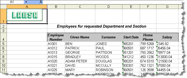 4. Excel でドキュメントを開き内容を確認します。出力は正しい行と列に書き込まれているはずです。現状では、数値データの書式が正しく設定されていません。Excelドキュメントは以下のようになっているはずです。