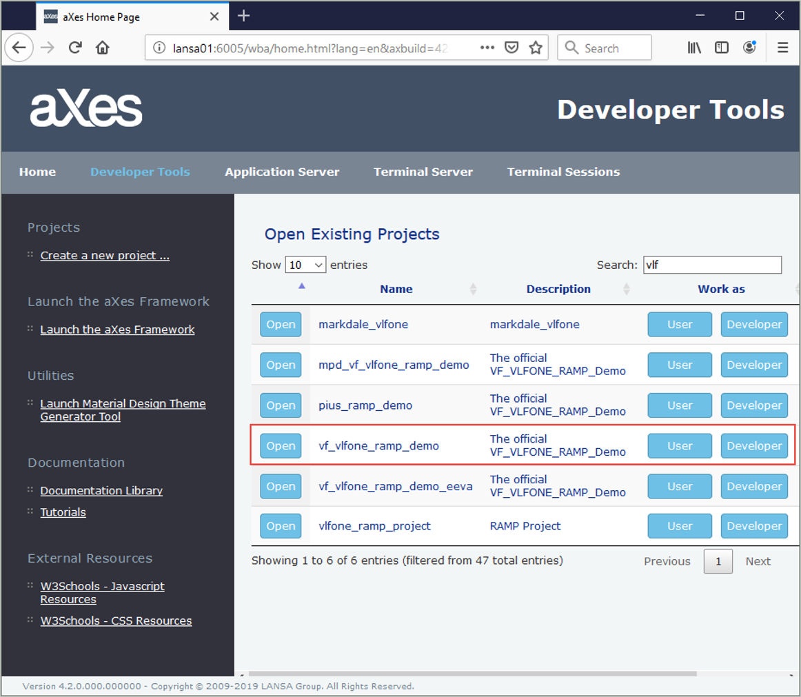 aXes 開発者ホームページを開始し、vf_vlfone_ramp_demo プロジェクトが存在し、その説明が正しいことを確認します。
