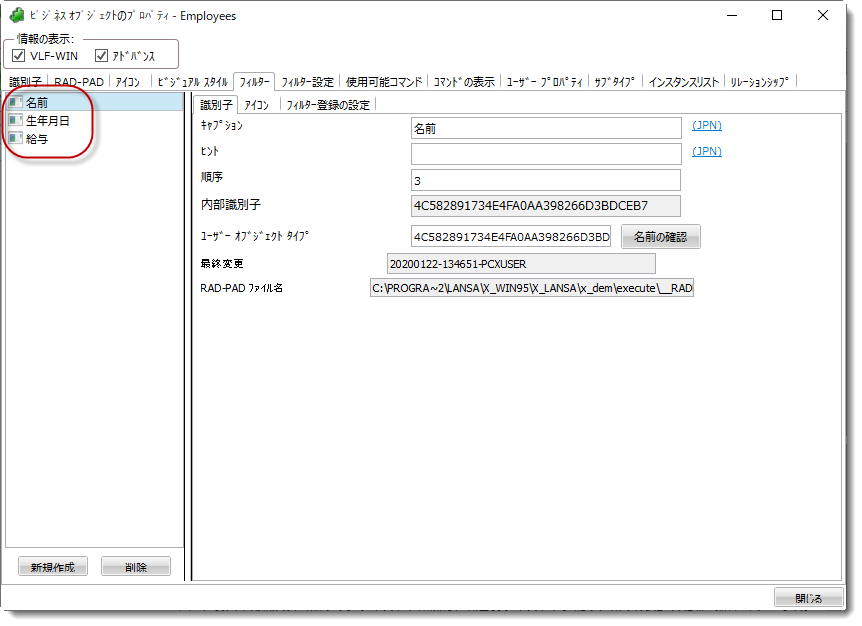 1. Employees ビジネス・オブジェクトをダブルクリックし、そのプロパティを表示します。