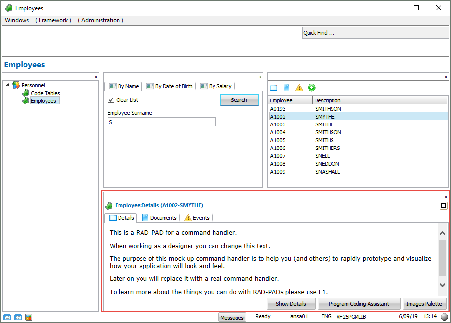 - フレームワークで、インスタンス・リストの社員を選択し、社員に関連付けられているコマンド・ハンドラーを表示します。