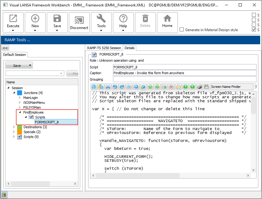 1. 画面とスクリプトのリストでジャンクション画面 FindEmployee を選択します。
