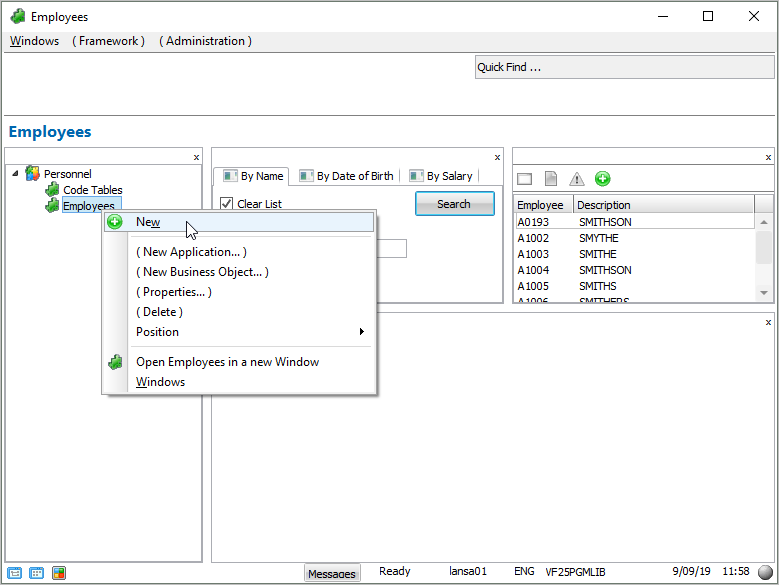 4. フレームワークを表示し、ナビゲーション・ペインで Employees ビジネス・オブジェクトを選択します。次に、フィルターを使用してインスタンス・リストに入力し、Employees ビジネス・オブジェクトまたはインスタンス・リストの1人の社員を右クリックして、コンテキスト・メニューを表示します。