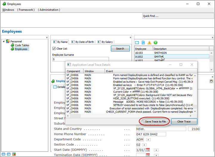 - 社員詳細が表示されたら、フレームワーク・メニューを使用してアプリケーション・トレースを開始します。
