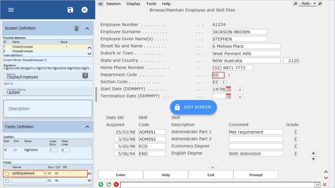 このステップでは、DisplayEmployee 画面の [部門コード] フィールドに名前を付けて、そのフィールドに特殊なフィールド処理を追加できるようにします。
