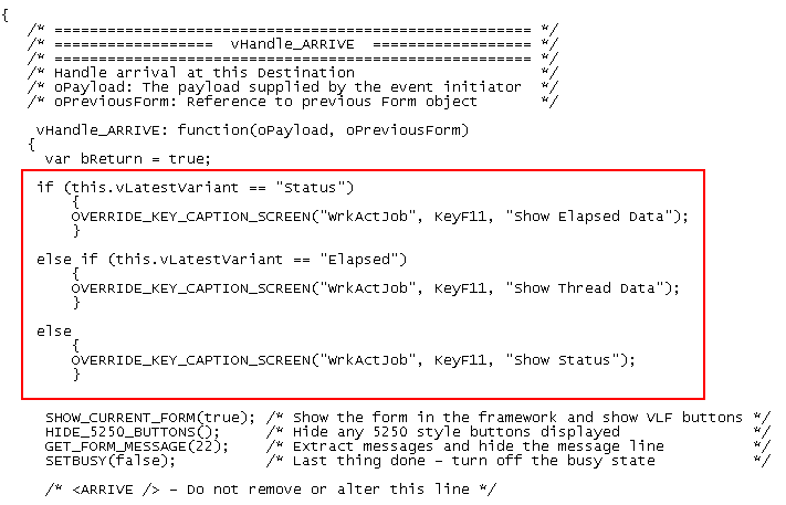 5. vHandle_ARRIVE ファンクションで、bReturn 変数宣言の後に IF... ELSE IF... ELSE ステートメントを追加し、どの画面バリアントが表示されているかを確認し、ボタンのキャプションを設定します。