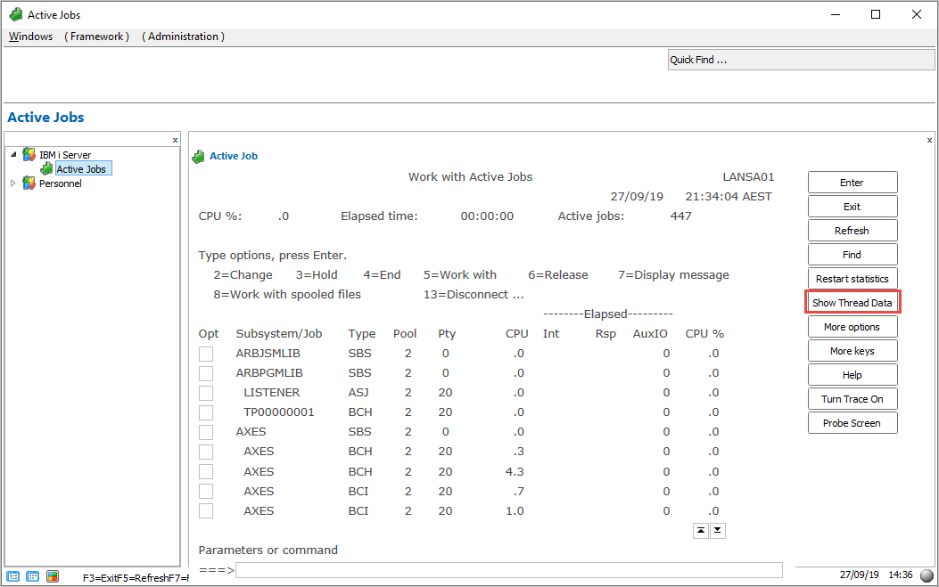 1.   [フレームワーク] ウィンドウで、アプリケーション「IBM i サーバー」と ActiveJobs ビジネス・オブジェクトを選択して、「アクティブなジョブの処理」画面を表示します。