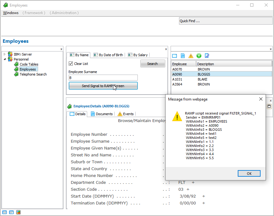 フィルターは、フレームワーク全体のシグナルを送信します。DisplayEmployee 画面の vHandle_AVEVENT ファンクションは、このシグナルを受け取り、シグナルの受信とペイロードの内容を示すメッセージ・ボックスを表示します。