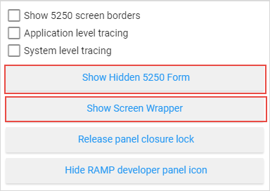 ラッパー・フォーム上の簡素なフィールド XXXXXXXXXXX ごとに Changed イベント・ハンドラー・ルーチンが生成されます。これらのルーチンは変更された Visual LANSA のラッパー・フィールド値を基となる 5250 フォームに送り返します。RAMP 開発パネルを使用して、[画面ラッパーの表示] と [非表示 5250 フォームの表示] ボタンを切り替えて、このプロセスが正しく行われているかを確認することができます。