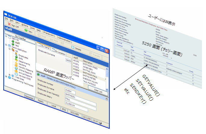 RAMP 画面ラッパーは、背後で 5250 画面にアクセスする、Visual LANSA コンポーネントです。アクセスされる画面およびフィールドはコレオグラフすることで、通常通りに定義されています。